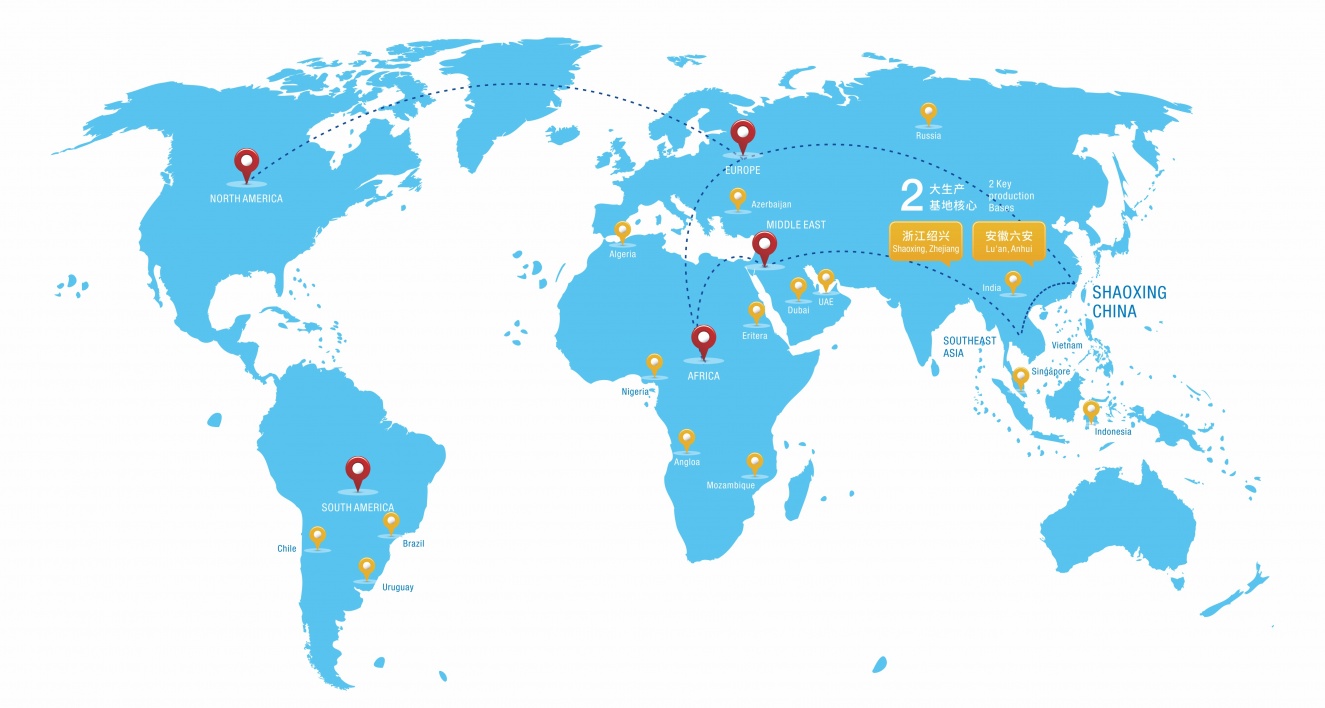 公司立足國內的同時,以國際標準合理調整市場布局,以點帶面輻射全國及國際業務。以浙江紹興和安徽六安兩大生產基地為核心,